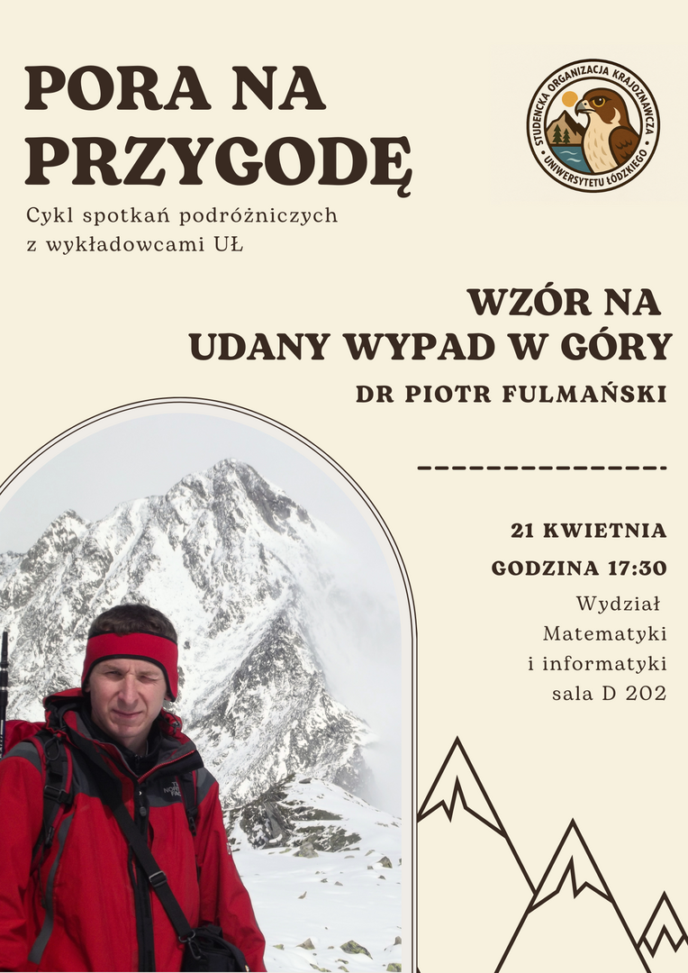 Studencka Organizacja Krajoznawcza Uniwersytetu Łódzkiego (SOK UŁ) zaprasza na inspirujące spotkanie podróżnicze z dr. Piotrem Fulmańskim, wybitnym wykładowcą z Katedry Sztucznej Inteligencji i Analizy Nieliniowej na Wydziale Matematyki i Informatyki Uniwersytetu Łódzkiego