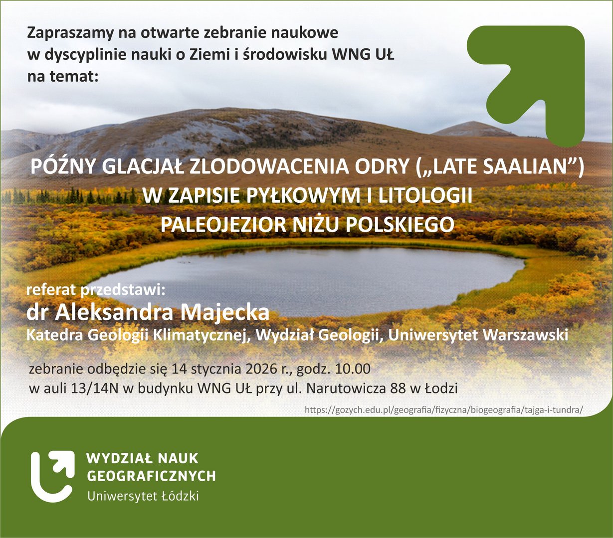 Zapraszamy na otwarte zebranie naukowe w dyscyplinie nauki o Ziemi i środowisku WNG UŁ podczas którego dr Aleksandra Majecka z Katedry Geologii Klimatycznej, Wydziału Geologii, Uniwersytetu Warszawskiego przedstawi najnowsze wyniki badań nad paleogeografią schyłku zlodowacenia odry uzyskanych na podstawie badań litologicznych i paleobotanicznych.